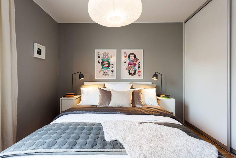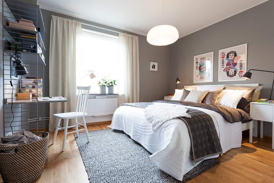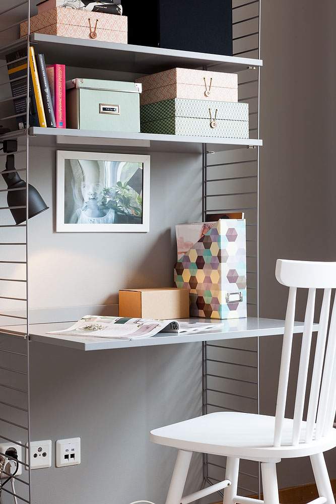 La chambre principale a été divisée en deux parties, un espace couchage et un petit espace de travail ou vous retrouvez un système d’étagères minimalistes STRING bien connu dans les pays scandinaves.