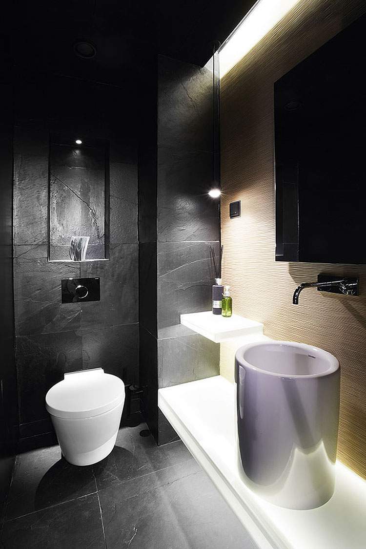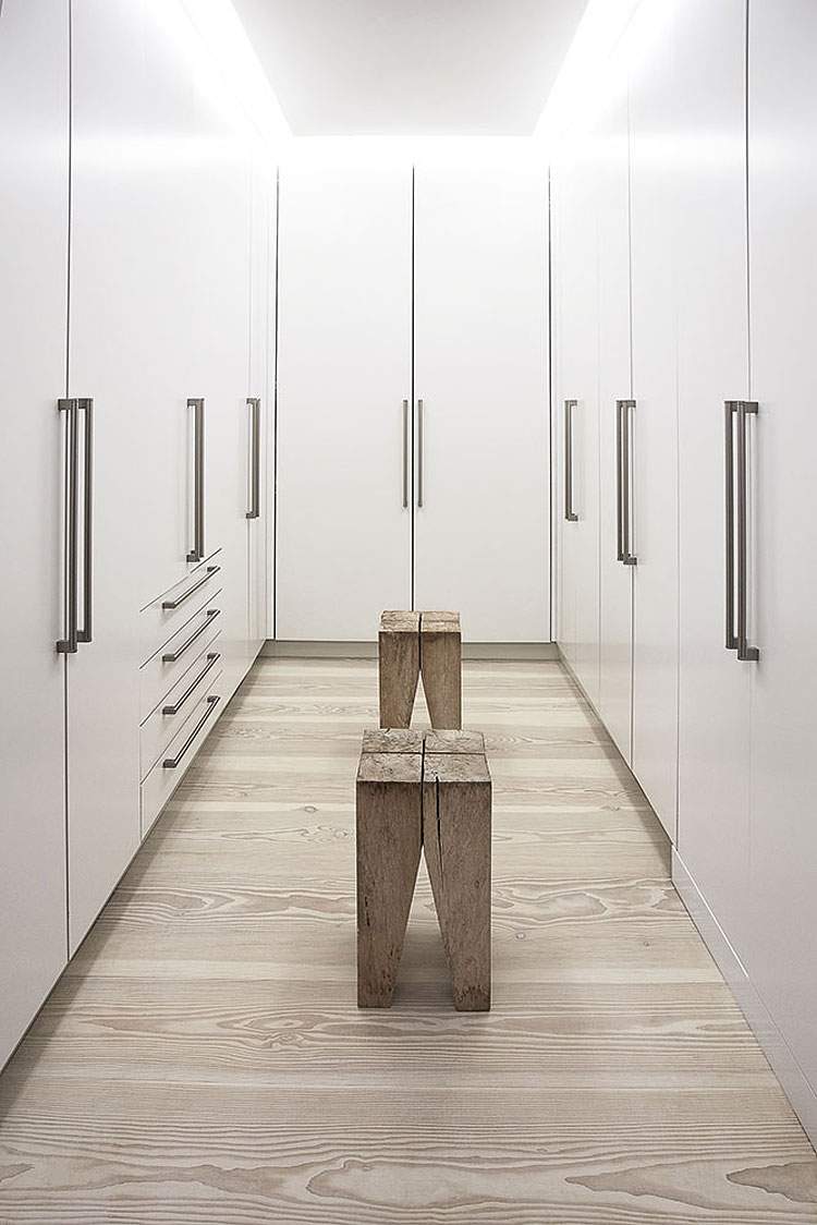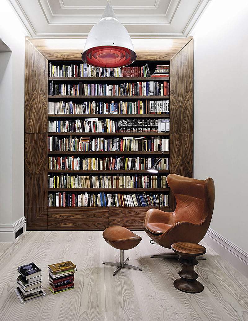 La partie la plus impressionnante de l’intérieur est sans doute la grande bibliothèque en bois et stockant un nombre important de livres tout en ajoutant également une touche naturelle à l’environnement épuré de l’appartement.