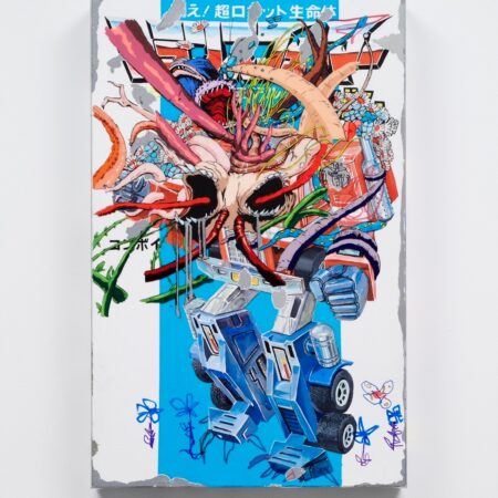 About YOKOSAKA TATSUYA - YOKOSAKA TATSUYA was born in 1981 in Gunma Prefecture and currently works in Tokyo. Inspired by celluloid painting techniques, he creates his works by superimposing images drawn on transparent vinyl chloride onto the canvas background. His works use elements from the 1980s, iconic figures, and classic anime characters to represent his own experiences as subject matter. They express admiration and hope for what humanity will accomplish in the future, while sharing a sense of pride and nostalgia for the past.