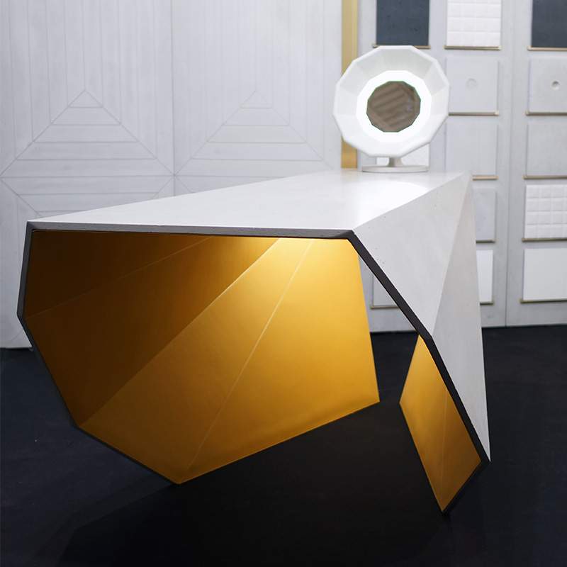 L’association Cuir/Béton est assez rare. Belle idée de Concrete LCDA et Matali Crasset qui imaginent un comptoir facetté, avec luminaire intégré. Une rencontre qui a lieu en Décembre 2010 et le début d’une collaboration dès le mois suivant. Dès lors la direction artistique globale de Concrete by LCDA se voit confié à la designer…