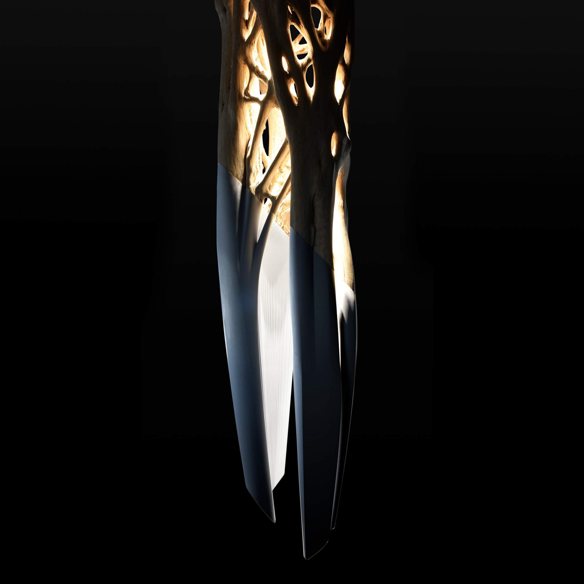 Descendant avec élégance de la voute, le lustre ONYX, de près de 3 mètres de long, vient quasiment toucher terre. Composé d’une pièce unique de bois de balité des Philippines, celle-ci se prolonge d’une greffe technologique réalisée avec les derniers moyens d’impression 3D. Ses formes parfaitement dessinées et ajustées au millimètre au bois brut rendent l’intégration invisible, tandis que l’essence opposée des deux matériaux ajustés est soulignée avec évidence grâce à une découpe en coupe franche qui constitue une signature propre à PEUGEOT…